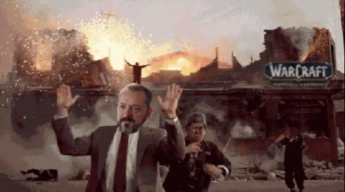 Paglalarawan ng Content: a man stands in front of a warcraft sign