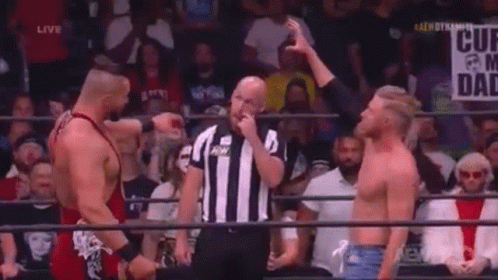 Paglalarawan ng Content: two men in a wrestling ring with a sign that says curse me daddy on it