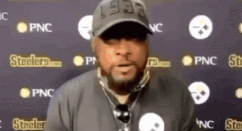 Paglalarawan ng Content: a man wearing a hat and a microphone is standing in front of a wall with steelers logos .