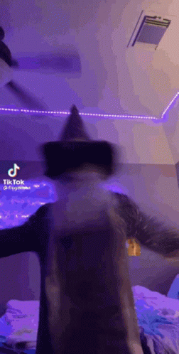 Paglalarawan ng Content: a person in a witch costume is dancing in a room with purple lights on the ceiling .