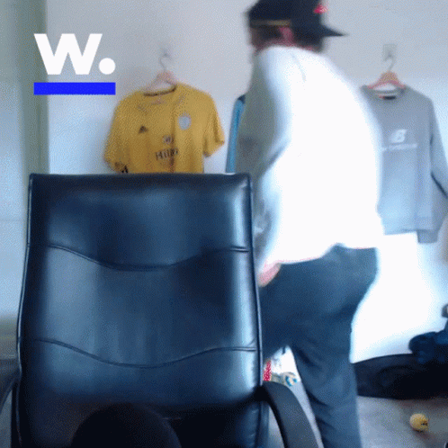 Paglalarawan ng Content: a blurry picture of a man standing in front of a wall with shirts hanging on it and a w. logo