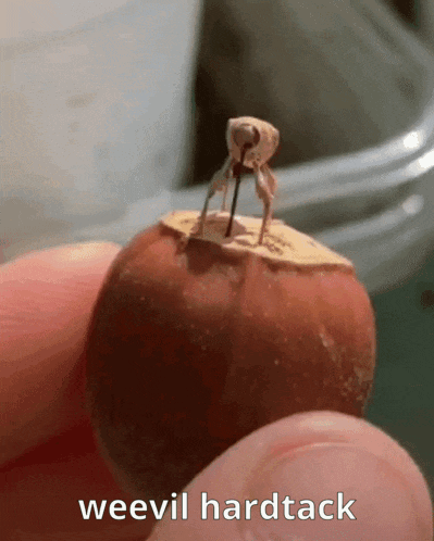 Paglalarawan ng Content: a person is holding a small bug that says weevil hardtack on the bottom