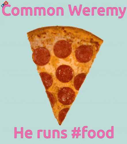 Paglalarawan ng Content: a slice of pepperoni pizza on a colorful background with the words common wremy he runs #food