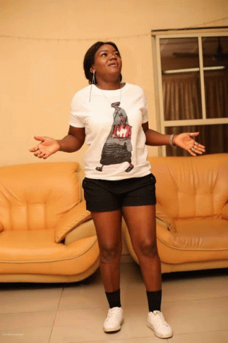 Paglalarawan ng Content: a woman wearing a white t-shirt with a picture of a man holding a bag of money