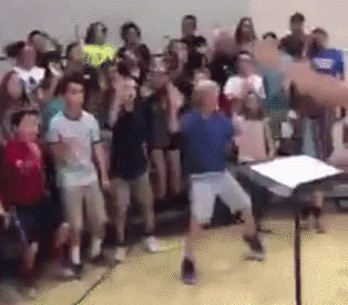 Paglalarawan ng Content: a man is standing in front of a large group of people dancing in a gym .