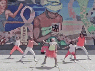 Paglalarawan ng Content: a group of young girls are dancing in front of a wall with a picture of a man on it that says apollo