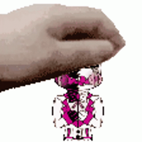 Paglalarawan ng Content: a hand is holding a pink and white cartoon character with a purple scarf around his neck .