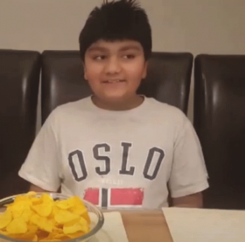 Paglalarawan ng Content: a boy wearing a white oslo shirt sits at a table with a bowl of chips