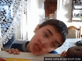Paglalarawan ng Content: a gif of a boy peeking over a table with the text make gifs at gifsoup.com