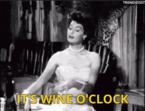 Paglalarawan ng Content: a black and white photo of a woman sitting at a table with the words " it 's wine o ' clock "