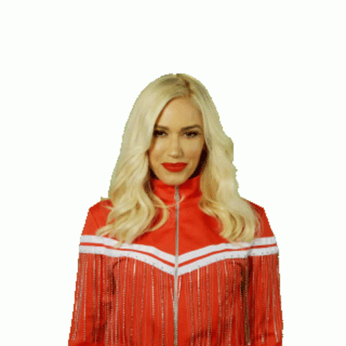 Paglalarawan ng Content: a blonde woman wearing a red jacket with fringe is making a funny face