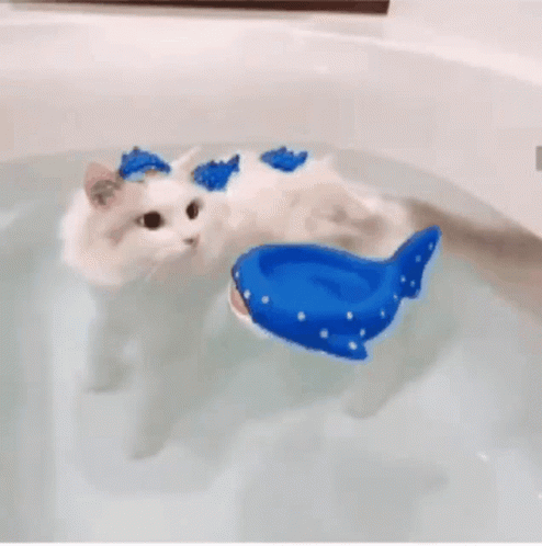 Paglalarawan ng Content: a white cat is swimming in a bathtub next to a blue whale float .