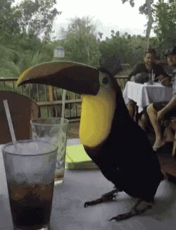 Paglalarawan ng Content: a toucan is sitting on a table next to a glass of soda