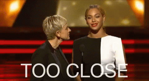 Paglalarawan ng Content: two women are standing next to each other on a stage and the words too close are on the screen .