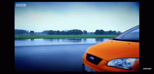 Paglalarawan ng Content: an orange car is driving down a wet road with bbc on the screen