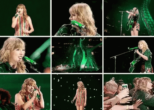 Paglalarawan ng Content: a collage of images of taylor swift singing into a microphone on a stage .