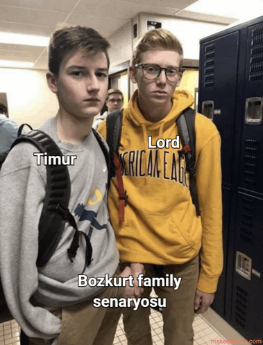 Paglalarawan ng Content: two boys are standing next to each other in a hallway and one has a hoodie that says lord american eagle