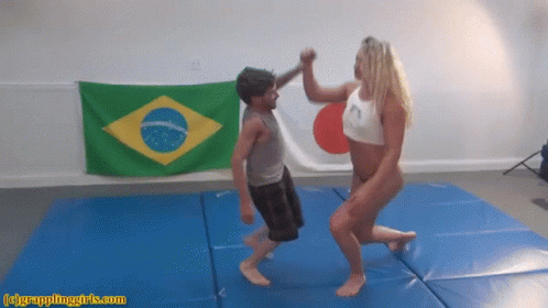 Paglalarawan ng Content: a man and a woman are wrestling on a mat with a brazilian flag behind them
