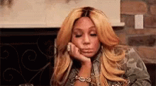 Paglalarawan ng Content: a woman with long blonde hair is sitting at a table with her hand on her chin .