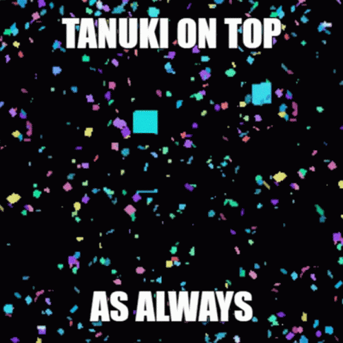 Paglalarawan ng Content: tanuki on top as always is written on a black background with colorful confetti
