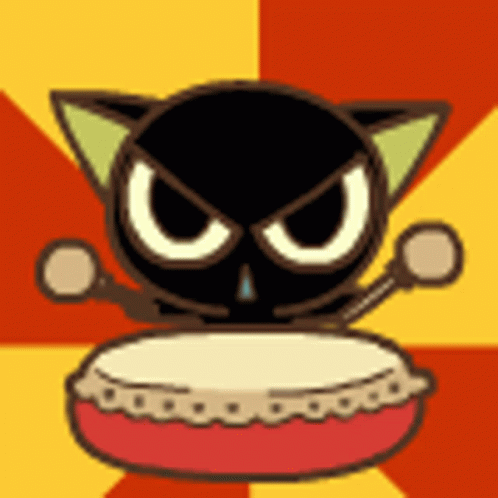 Paglalarawan ng Content: a black cat is sitting on top of a drum with a yellow and red background .