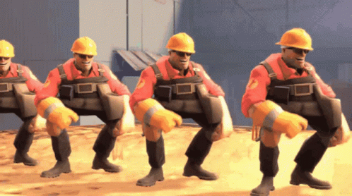 Paglalarawan ng Content: a group of construction workers wearing hard hats are dancing together