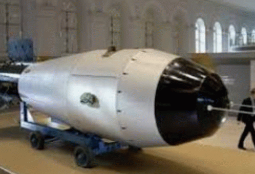 Paglalarawan ng Content: a large bomb is sitting on top of a cart in a room .