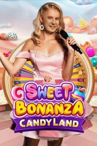 Paglalarawan ng Content: a woman in a pink dress is singing into a microphone in front of a candy land wheel .