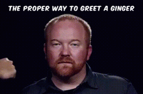 Paglalarawan ng Content: a man with a beard is pointing at the camera with the words the proper way to greet a ginger written above him