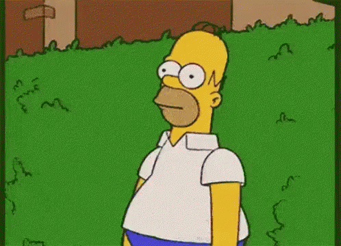 Paglalarawan ng Content: homer simpson is standing in the grass behind a bush and looking at the camera .