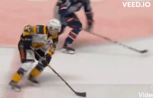 Paglalarawan ng Content: a hockey player is holding a puck while another player tries to stop him