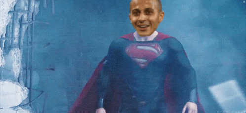 Paglalarawan ng Content: a man in a superman costume is standing in front of a blue wall