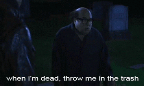 Paglalarawan ng Content: a man says when i 'm dead throw me in the trash in front of a tombstone