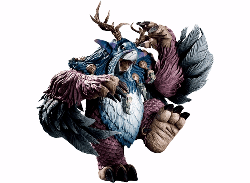 Paglalarawan ng Content: a statue of a creature with feathers and antlers on a white background