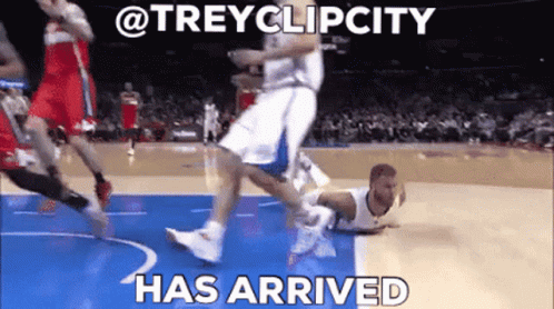Paglalarawan ng Content: a basketball player is falling on the court and the caption says trey clipcity has arrived