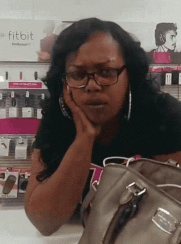 Paglalarawan ng Content: a woman wearing glasses holds her hand to her chin in front of a sign that says fitbit