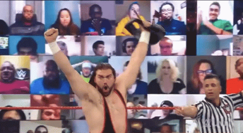 Paglalarawan ng Content: a wrestler is raising his fist in the air in front of a crowd while a referee looks on .