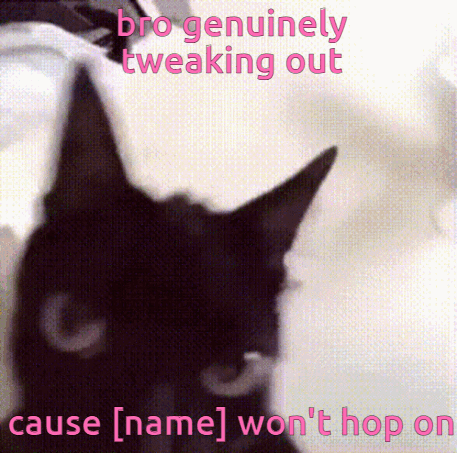 - Paglalarawan ng Content: a black cat with the words " bro genuinely tweaking out cause [ name ] won 't hop on " on the bottom