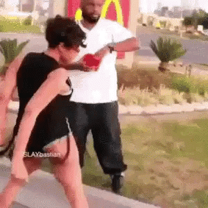 Paglalarawan ng Content: a man and a woman are fighting in front of a mcdonald 's .