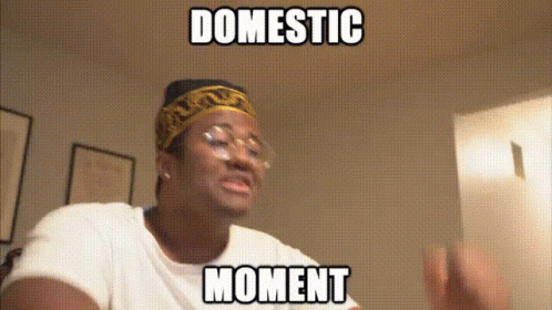 Paglalarawan ng Content: a man wearing glasses and a headband with the words domestic moment above him