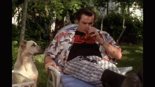 Paglalarawan ng Content: a man in a hawaiian shirt sits in a chair with a dog behind him