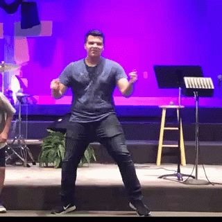 Paglalarawan ng Content: a man in a blue shirt stands on a stage in front of a purple background