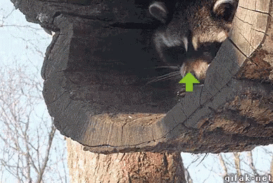 Paglalarawan ng Content: a raccoon is looking out of a hole in a tree trunk