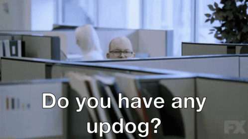 Paglalarawan ng Content: a man sitting in a cubicle with the words " do you have any updog " above him