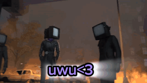 Paglalarawan ng Content: a group of people with televisions on their heads standing next to each other with the words uwu < 3 above them .