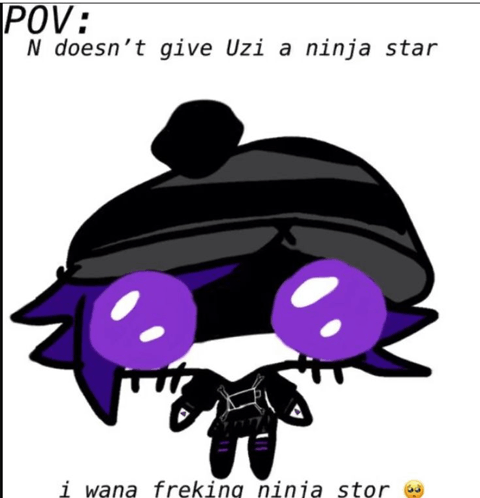 Paglalarawan ng Content: a drawing of a person with purple eyes and the words pov n doesn t give uzi a ninja star