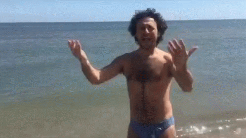 Paglalarawan ng Content: a shirtless man in blue swim trunks is standing on the beach .