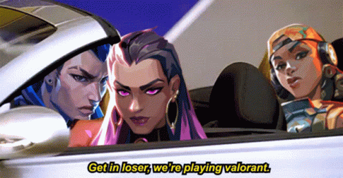 Paglalarawan ng Content: three cartoon characters in a car with the words get in loser we 're playing valorant on the bottom