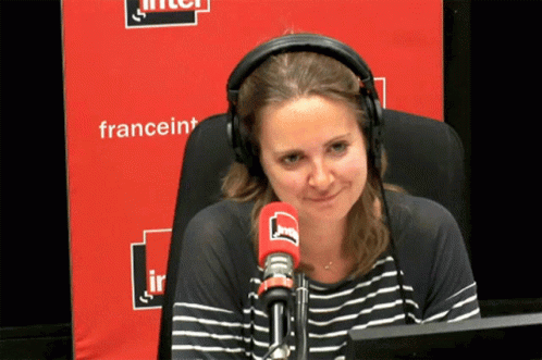 Paglalarawan ng Content: a woman wearing headphones stands in front of a microphone in front of a franceint sign