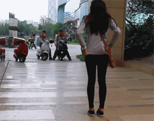 Paglalarawan ng Content: a woman standing on a sidewalk looking at a group of people riding scooters